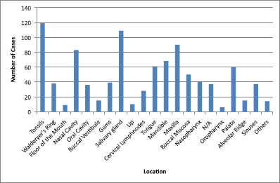 Figure 4. Location of lymphomas in head and neck region. Locations are listed as reported in the articles. N/A = not available; Others = lip commissure, zygomatic bone, masseter, and retromolar trigone.