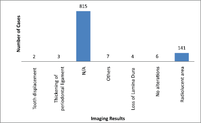 Figure 5. Imaging results. N/A = not available. Others = mandibular fracture, poor alveolar scarring, unclear image, image evoking invasive lesion, 6 cm increase, and infiltrative lesion.