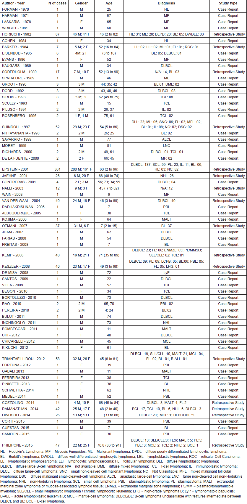 This systematic review includes the presentation of 982 cases reported in 73 scientific papers, including 76 patients described in case reports papers and 906 patients presented in retrospective studies (Table 1). The articles were generated over the last 45 years which is when most studies on the subject were published, according to our search. The articles identified revealed a shortage of studies addressing the oral manifestations of lymphoma. The few studies addressing the oral manifestations presented few details about the intraoral clinical manifestations of lymphoma or radiographic findings. This shortcoming may be because of the challenging nature of studying and treating such patients.