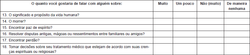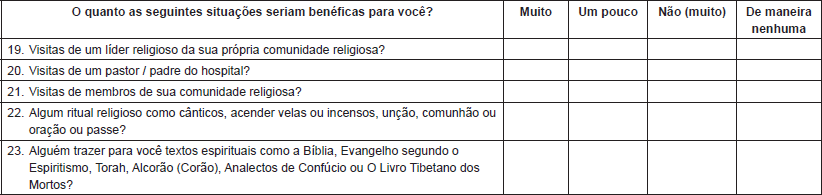 For example, in our study, adjustments were required for including the item of the 'gospel according to spiritism' book and 'pass', as kardecist spiritism is a common practice in Brazil. Still as regards items 22 and 23, we verified that the participants were curious about practices being different from those stated, creating the hypothesis that the instruments that address spirituality, with the possibility of promoting questioning, can also be a kind of intervention. These stimulate the participants to think and reflect on their own spirituality besides measurement of demand.