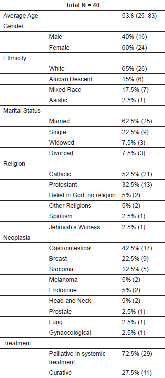 The following features of the participating patients were collected: age, gender, auto-referred race, civil status, religion, neoplasia type, and treatment intent.