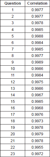 The correlation analysis of each item with the total score of the questionnaire showed internal validity with coefficients above 0.99 for all questions (Table 3).