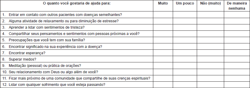 A systematic review published in 2011 reports 35 instruments validated for the assessment of spirituality and four with the concept of need of spirituality: Spiritual Need Inventory (SNI) - assessed for patients near the end of life, Spiritual Interests Related to Illness Tool (SpIRIT) - developed for patients and family members, Spiritual Needs Scale (SNS) - Korean questionnaire with 26 items validated by Yong et al [6], and the Spiritual Needs Questionnaire (SpQN) - developed for patients with chronic diseases [7]. Another systematic revision of spirituality questionnaires in the Portuguese language shows the existence of 20 instruments, 15 of which are translated from other languages, but without the different instruments of spiritual need [8].