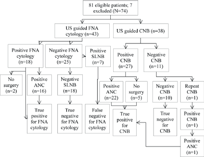 A total of 81 patients had preoperative biopsy (CNB, n = 38; FNA cytology, n = 43). The results are shown in Figure 1: seven patients had positive cytology/histology that did not undergo definitive surgery and hence were excluded from the analysis (N = 74).
