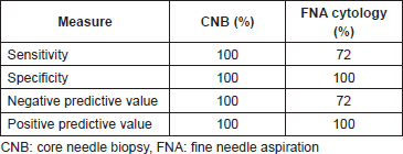 Table 1. Diagnostic performance of CNB and FNA cytology.