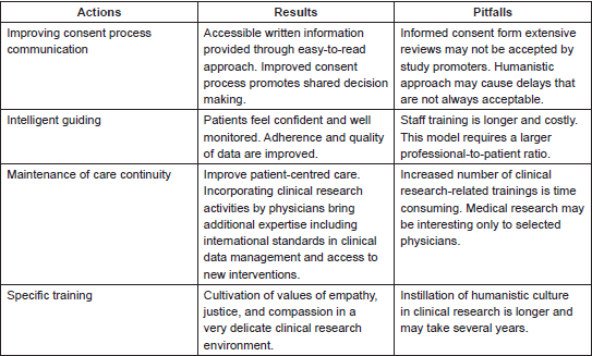 In this article, we have described some practical aspects that promote the humanisation of clinical research. Actions are not limited to improving the communication skills of medical staff but also include the promotion of care continuity, accessible written information, and application of theoretic models such as SDM and management of stress in decision-making under uncertainty. We believe that a comprehensive strategy will increase patients’ motivation to participate in and adhere to clinical research. The supportive environment provided through humanisation improves communication quality and ultimately transforms the relationship between investigator and volunteer to one of trust.