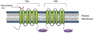 Figure 1. P-gp structure: The core structure of P-gp includes two homologous halves, each half comprising of six transmembrane domains with a nucleotide binding domain.