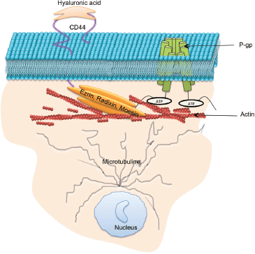 Figure 4. Protein–protein interactions which support P-gp drug efflux function: P-gp drug efflux function and intercellular transfer has been shown to to be regulated by a number proteins including microtubule, ezrin, radixin, moesin, and CD44.