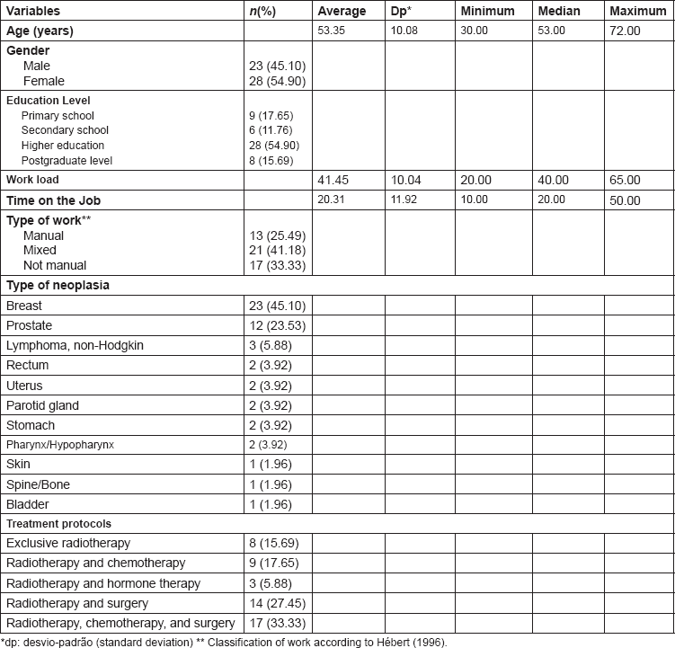 The population of this study was made up of patients undergoing radiotherapy, with any type of malignant tumour. The final sample, however, was comprised of 51 participants. The sample was defined by non-probability convenience sampling, based on the information of all patients admitted during the period, considering that the removal of work activities is a common recommendation for patients with an oncological diagnosis, in compliance with the following inclusion criteria: diagnosis of neoplasm confirmed by anatomopathological examination, aged 18 years or older and less than 75 years old by inclusion in the workforce, undergoing radiotherapy protocol in the teletherapy modality with exposure to a minimum dose of 2000cGy, when the onset of the first unwanted acute effects are expected arising from cumulative exposure to ionising radiation, termination of radiotherapy treatment for a maximum of two years (24 months), at which time complaints related to the exposure to ionising radiation become less likely [11], maintenance of work activities, formal or informal, with a minimum weekly load of 20 hours. The exclusion criteria considered were illiteracy, due to the impossibility of filling out forms, and the undertaking of an exclusive radiotherapy protocol in the brachytherapy modality.