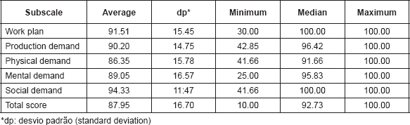 The aforementioned instrument enables assessments in the fields of physical requirements, measuring the ability to perform work activities that include physical, dynamic and static loads, such as heavy objects, movements, resistances, coordination and flexibility; mental, considering cognitive demands related to attention and concentration; social, referring to interactions of the individual with coworkers and company clients; in work planning, checking the worker’s difficulties in planning and managing their daily occupational activities, from the beginning to the end of the workday; and demand for production, covering productivity, quality of service and job satisfaction; this set of information is not found in another single instrument of assessment in the field of workers’ health [12, 13].
