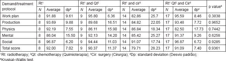 There was an observation of higher average work functioning indexes for social demand, with 94.33 (11.47). In turn, the worst indexes were registered in physical demand. No significant differences were observed between groups of treatment protocols in terms of WRFQ-Br scores.
