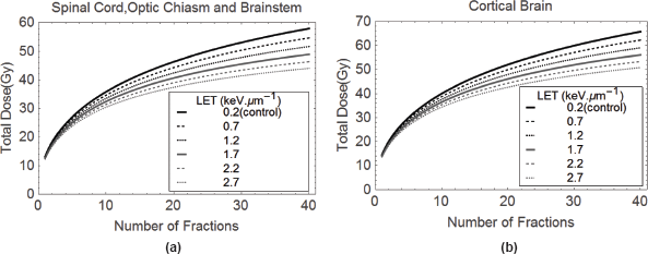 where dL is the control dose per fraction, n are the number of treatments and RBEmax and RBEmin represent the limits of RBE at very low and very high dose, respectively, each given by αHL and√βH/√βL. It can be noted that the same α/β ratio (that of the low LET) is used throughout, since the RBE limits are effectively multipliers of this basic ratio. In this way, a dose of 50 Gy in 25 fractions of 2 Gy, which denotes the conventionally used tolerance value for spinal cord tissue, provides 100 Gy (for α/β = 2) on the left-hand side. Providing the RBE limits are known with reasonable accuracy, then the equivalent dose for combinations of dH and nH can be found. Two graphical examples are presented in Figures 4 (a&b) for spinal cord and cortical brain radiation tolerances, where the isoeffective doses compensate for LET increases by a change in the RBE. In this way, clinicians can select reasonable dose-fractionation schedules that would protect critical normal tissues, or at least use these recommendations as boundary conditions not to be exceeded.