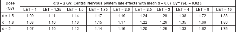 In order to provide an easier read out of RBE values than in 3-D plots, Table 1 estimations of RBE in nervous system tissues with α/β = 2 Gy, based on the radiobiological parameters shown and using the model in reference [7], which adjusts both α and β with LET, using 0.22 keV.mm−1 as the control LET.