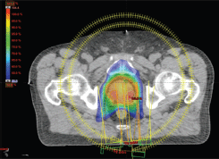 Figure 2. Axial view of a volumetric arc therapy (VMAT) treatment plan for prostate cancer delivered with RapidArc, with SIB to DILs.