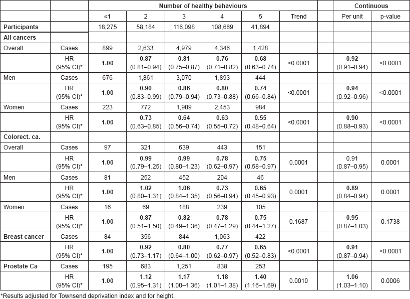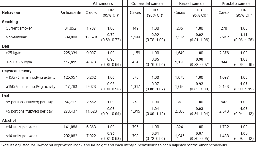 Results: Compared with subjects who followed none or a single healthy behaviour, a healthy lifestyle based on all five behaviours was associated with a reduction of about one-third in incident cancer (hazard ratio [HR] 0.68; 95% confidence intervals [CI] 0.63–0.74). Colorectal cancer was reduced in subjects following the five behaviours by about one-quarter (HR 0.75; 95% CI 0.58–0.97), and breast cancer by about one-third (HR 0.65; 95% CI 0.52–0.83). The association between a healthy lifestyle and prostate cancer suggested a significant increase in risk, but this can be attributed to bias consequent on inequalities in the uptake of the prostate specific antigen screening test.