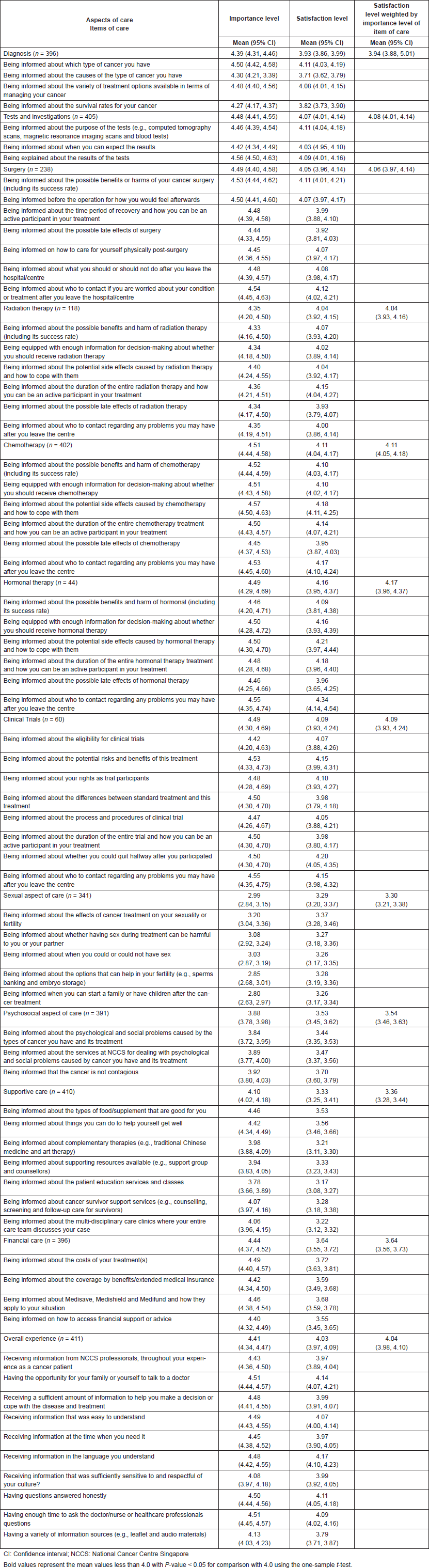 The importance and satisfaction level of the information needs were estimated using mean and corresponding 95% confidence intervals for each domain of the need assessment questionnaire. To account for importance level in the satisfaction level of the information, the weighted mean satisfaction level for overall experience on information received was calculated as the mean of the products of the satisfaction-and importance-level responses. The weighted mean satisfaction level for each domain of information needs was likewise calculated. Finally, all mean and weighted mean importance and satisfaction values were compared with 4 (important or satisfied) using the one-sample t-test. Patients who had not answered any items were excluded from that domain-specific analysis. Statistical analyses were performed using SPSS version 20.