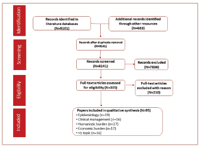 The literature search identified 9,101 records through the selected databases and 638 records using other resources (congresses, websites and proprietary HTA accelerator database). After duplicates were removed, 8,141 records were screened and 7,836 were excluded based on the eligibility criteria. A full-text analysis was conducted on the remaining 305 articles and resulted in the exclusion of 210 articles that did not meet the eligibility criteria. A total of 95 references were included in the qualitative analysis. Epidemiology outcomes were reported in 19 records, clinical management in 16, humanistic outcomes in 27 and economic outcomes in 17. More than one outcome was reported in 16 articles (Figure 1).