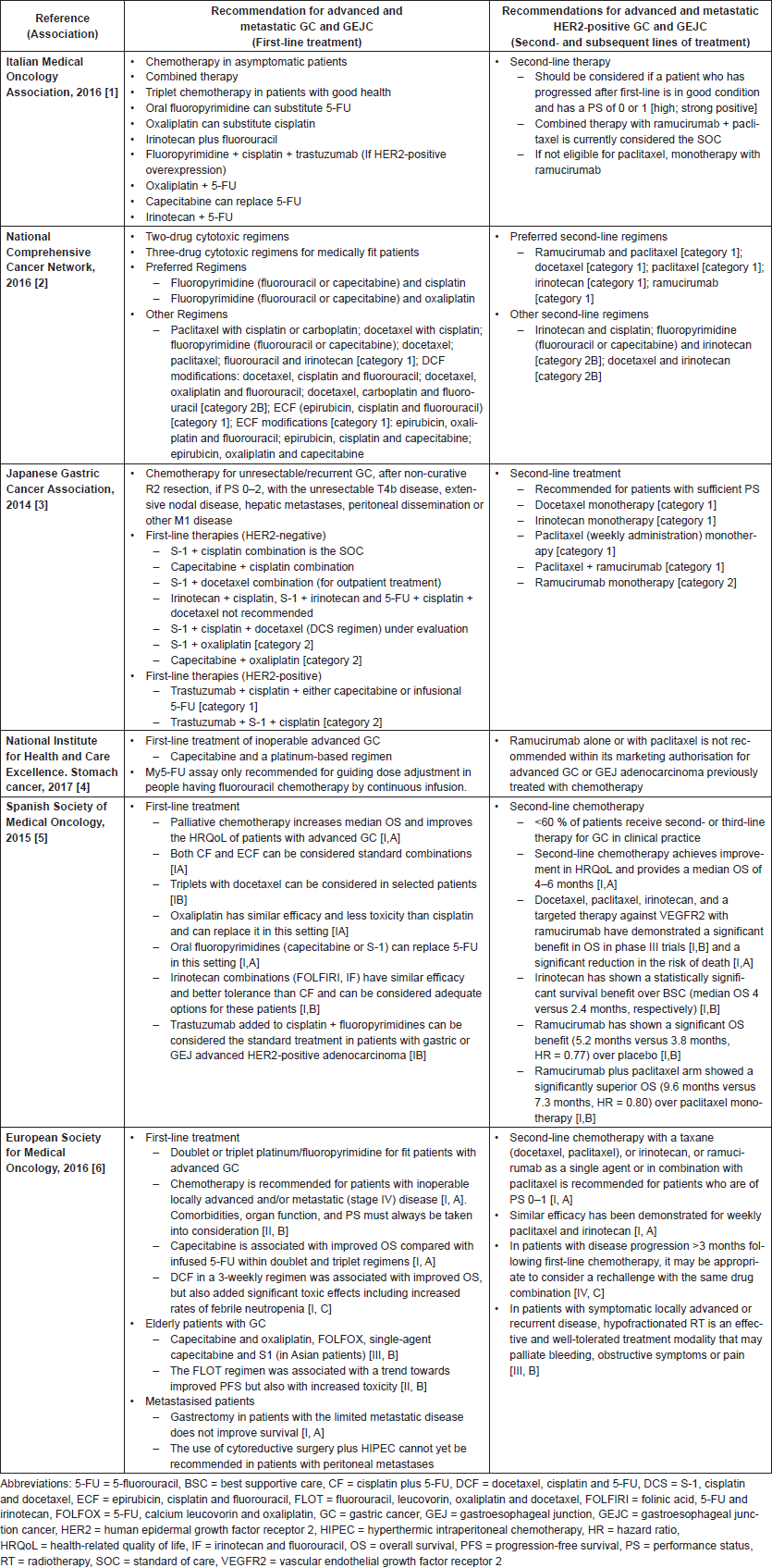 Six guidelines (Europe, Italy, Japan, Spain, UK and the US) provide recommendations for first-line therapy for advanced and metastatic GC and GEJC [3, 47, 5658, 60]. Chemotherapy is the recommended first-line therapy for advanced GC and GEJC but there is no consensus among the available guidelines on the specific regimen that should be used (Table S1 and S2 in Supplement). The US [60] and Japanese [57] guidelines recommend doublet over triplet chemotherapy to reduce toxicity and indicate that triplet therapy be used only in fit patients who have frequent access to toxicity screenings. The US guidelines recommend a regimen with a 5-Fluorouracil (5-FU) or capecitabine and either cisplatin or oxaliplatin, whereas the Japanese guidelines recommend a regimen of S-1 and cisplatin as the first choice, followed by the combination of capecitabine and cisplatin. The European guidelines [3] recommend both doublet and triplet protocols, and favour EOX (epirubicin, oxaliplatin and capecitabine) over ECF (epirubicin, cisplatin and fluorouracil) and capecitabine over infused 5-FU due to better overall survival. For the management of HER2-positive GC and GEJC, all guidelines recommend adding trastuzumab to first-line chemotherapy regimens, which commonly include cisplatin and a fluoropyrimidine [56, 58, 60]. Second lines of chemotherapy include the same regimens for GC and GEJC and are generally based on the patients’ condition. The preferred regimen for second-line treatment is ramucirumab plus paclitaxel, or ramucirumab monotherapy if the patient is not eligible for paclitaxel (Table S2 in Supplement) [3, 10, 5658]. A PD-1 inhibitor has recently been approved as third-line or higher therapy for GC/GEJC patients in the US [61].