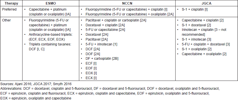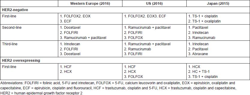Evaluation of the reports of advanced stage GC and GEJC management in clinical practice shows a lack of consensus on the choice of chemotherapy regimens. In 2016, the most commonly prescribed first-line chemotherapy regimens for HER2-negative or unknown status of GC or GEJC were FOLFOX (5-FU, calcium leucovorin and oxaliplatin), EOX and ECF in the US and in Europe, while TS-1 plus cisplatin and TS-1 plus oxaliplatin were mostly used in Japan [62]. Differences among guidelines have also been observed for HER2 overexpressing tumours. In the US, the most common first-line regimens in 2016 were trastuzumab plus cisplatin plus 5-FU, trastuzumab plus cisplatin plus capecitabine, and FOLFOX, whereas in Western Europe they were trastuzumab plus cisplatin plus 5-FU, and trastuzumab plus cisplatin plus capecitabine. In Japan, the most commonly used regimens in 2015 were trastuzumab plus cisplatin plus capecitabine, trastuzumab plus cisplatin plus TS-1, and TS-1 plus cisplatin (Table S3 in Supplement) [62].
