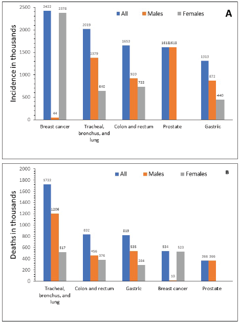Figure 2. Global incidence (a) and mortality (b) for different types of cancer in 2015. Source: Fitzmaurice 2017 [1].