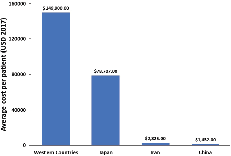 In Japan, the ASIR of GC has been decreasing in the last 30 years; however, an increase in the number of new GC patients has been reported during the same period due to the rapid population ageing [95]. The direct cost of GC management in Japan has increased between 1996 and 2008 and is predicted to continue to increase until 2020, whereas the total cost is expected to decrease (when considering constant mortality rate) [21]. In Portugal, the total cost of hospitalisation per patient for GC and oesophageal cancer between 2000 and 2010 was €6,422 and €5,049, respectively [32]. The average financial burden per patient was not reported in any of the examined studies. Therefore, using the data provided in the reviewed studies, we estimated a financial burden per patient associated with GC and GEJC in Western countries, Japan, Iran and China (Figure 3).