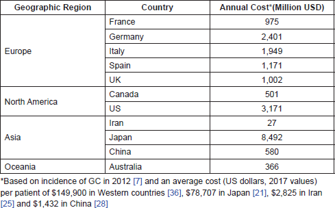 Based on the data reported in this review, we estimated that the annual financial burden of GC calculated for Europe (including France, Germany, Italy, Spain and the UK), Asia (including Iran, Japan and China), North America (Canada and the US) and Australia amounted to 20.6 billion USD in 2017.