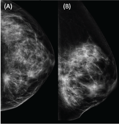 Figure 1. Left mammography showing a dense mammary pattern, with a heterogeneous spiculated dense mass located in the LIQ. BIRADS-5. Two clips marking the lesion prior to neoadjuvant treatment. (A) Craniocaudal and (B) mediolateral oblique view.