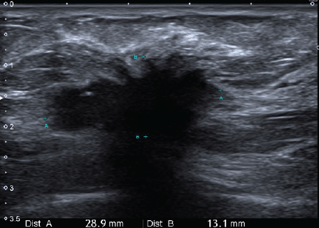 Figure 2. Ultrasonic left breast showing a hypoechogenic-spiculated mass with the acoustic shadow of 29 × 24 × 14 mm3 in correspondence with the mammographic image.