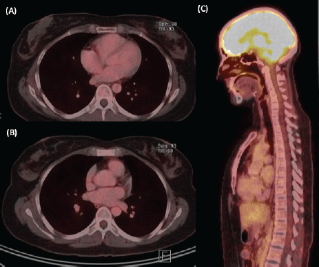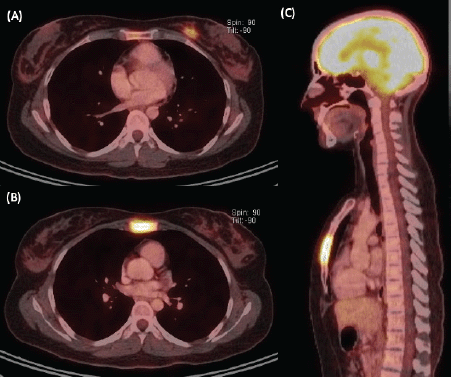 Figure 4. Re-staging imaging study, after 6 months of ST. (A) Axial view of PET/CT with size decrease and hypermetabolism resolution at the left breast nodule. (B) Axial and (C) sagittal views of PET/CT showing hypermetabolism resolution at the sternal body lesion.