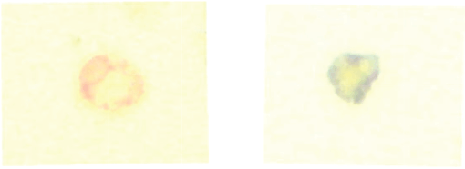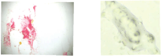 Figure 2. Bone marrow positive and negative for CEA expressing cells. Micro-metastasis CEA positive (red). Bone marrow negative for CEA.