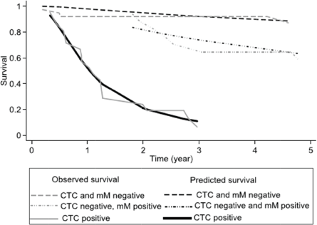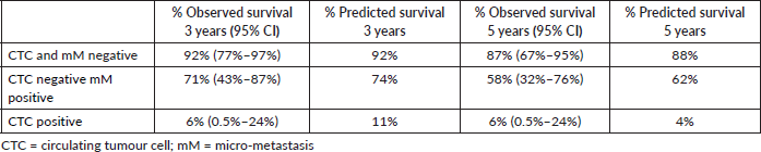 The RMST for treatment failure for the whole cohort was 3.6 years (95% CI 3.2–4.0 years). Table 4 shows the RMST at 5 years for each prognostic group, from the observed Kaplan–Meier and Predicted (FP model) survival models. The Log-rank test showed a significant difference between groups (p < 0.01). There was no significant difference for sex or age of the patient (p = 0.99). The calculated hazard ratios (baseline CTC and micro-metastasis negative) were for CTC negative micro-metastasis positive HR 1.30 (p = 0.02) and CTC positive 3.35 (p > 0.01). The observed survival (Kaplan–Meier) was concordant to the survival predicted by the flexible parameter model, Harrell’s C was 0.82 classified as good.