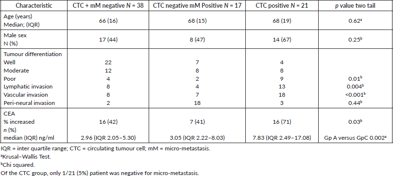 The observed cohort included 76 patients, 39 (51%) males with a median age of 67 years (IQR 16 years) and a median follow up time of 3.6 years (range 0.25–5.0 years). Patients negative for both CTC and micro-metastasis had a significantly higher frequency of well-differentiated tumours and significantly lower frequency of lymphatic and vascular invasion in the primary tumour. There were no significant differences with respect to age, sex or peri-neural invasion. Overall, 42/76 (55%) of patients had an increased serum CEA; the frequency of an abnormal level increased from patients negative for both CTC and micro-metastasis to patients CTC positive (p = 0.03). With respect to the median serum CEA level, the only significant difference was between patients negative for both CTC and micro-metastasis and patients CTC positive (Table 1).