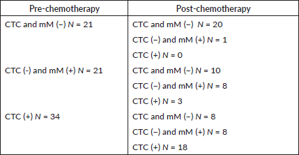 Prior to chemotherapy, 21 (28%) patients were negative for both CTC and micro-metastasis, 21 (28%) positive for micro-metastasis and negative for CTCs, and 34 (44%) were CTC positive. The response to chemotherapy was heterogeneous and the type of minimal residual disease pre-chemotherapy did not predict the response (Table 2).