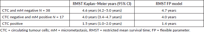 After chemotherapy, 38 patients were negative for CTC and mM, 17 were positive for only mM, and 21 for CTCs. For the whole cohort, the 5 year KM was 58%, the median survival was not reached. For the three prognostic groups, the KM 5-year survivals were 87%, 58%, and 4%, respectively, the median survival for patients MRD negative and mM only was not reached. RMST for the whole cohort was 3.6 years, for the three prognostic groups the RMST was 4.6 years, 4.0 years, and 1.5 years, respectively. Serum CEA was significantly higher pre-surgery in the CTC positive group. There were no significant differences with respect to age or sex between the three groups.