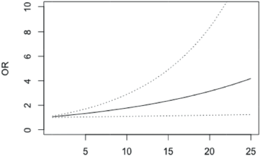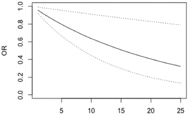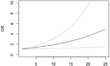 Figure 5. OR of not having depression in patients with differences in BRAS scale scores between 1 and 25 points (95% confidence bands for the OR are shown in dash lines).