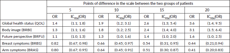 Table 4. OR and 95% profile likelihood confidence intervals of not having depressive symptoms between patients with differences in QOL, BRBI, BRFU, BRBS and BRAS scale scores of 5, 10, 15 and 20 points.