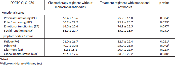 Table 8. Mean ± standard deviation of EORTC subscales QLQ-C30 for the group of patients treated with chemotherapy regimens without monoclonal antibodies and patients performing treatment regimens with monoclonal antibodies and p-values, both groups without depression.