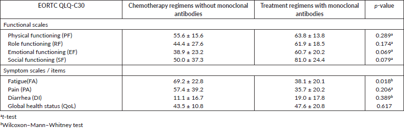 Table 6. Mean ± standard deviation of EORTC subscales QLQ-C30 for the group of patients treated with chemotherapy regimens without monoclonal antibodies and patients treated with treatment regimens with monoclonal antibodies and p-values, in both groups with depressive symptoms.