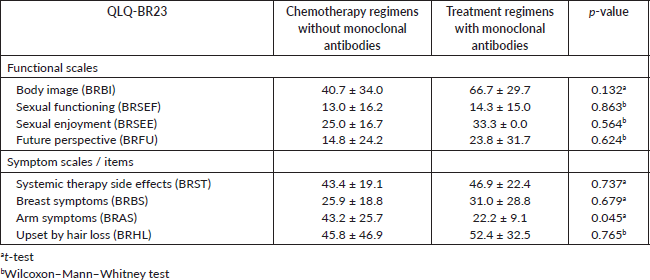 Table 7. Mean ± standard deviation of EORTC subscales QLQ-BR23 for the group of patients treated with chemotherapy regimens without monoclonal antibodies and patients treated with treatment regimens with monoclonal antibodies and