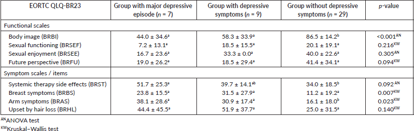 Table 2. Mean values ± standard deviation of the EORTC QLQ-B23 subscales for the group of patients with major depression, group of patients with depression and group of patients without depression and p-values. Subscript with non-common letters means that the difference between the two groups is statistically significant.