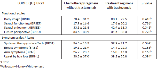 Table 3. Mean ± standard deviation of EORTC subscales QLQ-BR23 for the group of patients performing chemotherapy regimens without trastuzumab and patients performing treatment regimens with trastuzumab and p-values without considering the presence, or not, of depressive symptoms.