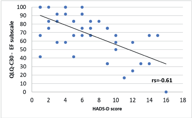 Figure 6. Correlation between HADS-D and the emotional functioning (EF) subscale of EORTC QLQ-C30.