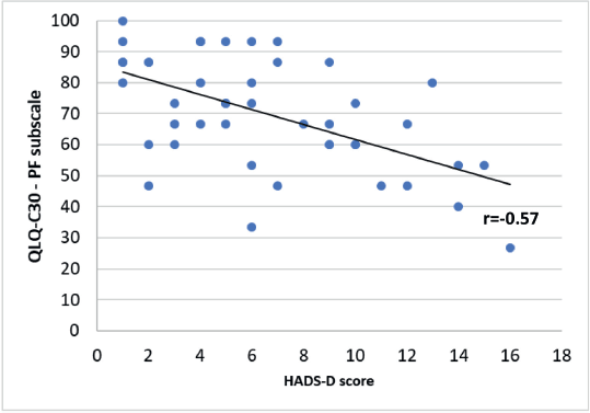 Figure 7. Correlation between HADS-D and the physical functioning (PF) subscale of EORTC QLQ-C30.