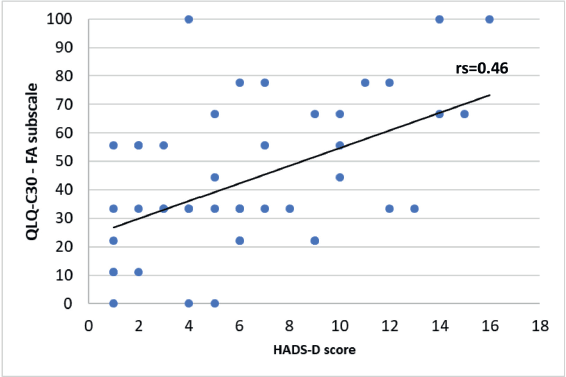 Figure 9. Correlation between HADS-D and the fatigue (FA) subscale of EORTC QLQ-C30.