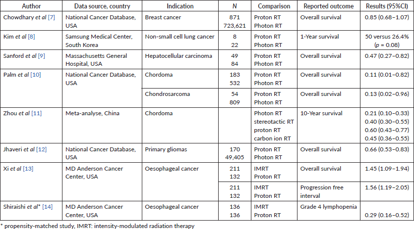We could identify some new observational studies comparing a photon with particle therapy (Figure 1). The overall survival (OS) in breast cancer patients was assessed using the US National Cancer Database between 2004 and 2014. The OS of patients that received proton therapy was not statistically significantly longer than those that received photon therapy [Hazard ratio (HR) 0.85 (95% Confidence interval (CI) 0.68–1.07)] [7].
