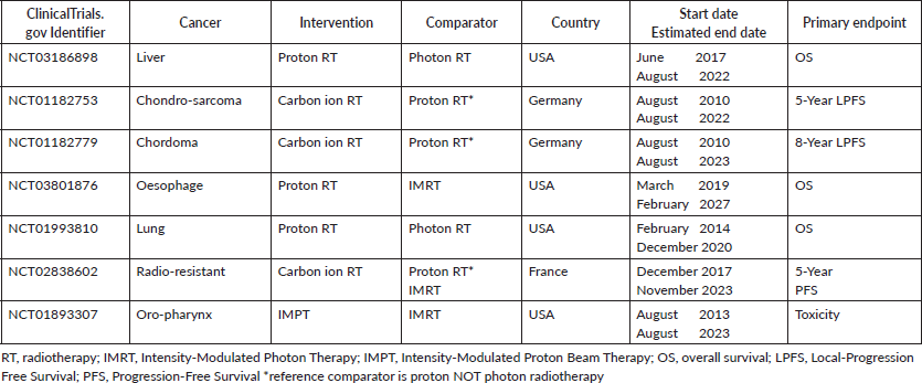 Radiotherapy (RT) after surgery is the second main treatment in solid tumours and far in front of systemic treatment [1]. The use of modern RT with image-guided RT (IGRT), intensity-modulated RT (IMRT), volumetric arc therapy (VMAT) and stereotactic body RT (SBRT) drastically decreased the side effects [2, 3]. In the continuous process for improvement, it was suggested that proton therapy, due to its Bragg peak, and carbon ions, due to the Bragg peak and to a higher radiobiologic effect (RBE), could have a promising future and become the best practice in radiotherapy. Randomised clinical trials (RCTs) are the gold standard to compare the effectiveness of one therapy over another [4]. Observational studies can only provide some indications about possible advantages from one therapy compared to another. The recent health technological assessment (HTA) report in Belgium [5] could not show any advantage for proton therapy over photon therapy. The Ludwig Boltzmann Institute published a recent systematic review for carbon ion beam RT [6]. They concluded that ‘carbon ion beam RT (CIRT) can be described as a potentially less invasive cancer treatment due to its physical properties. Due to the lack of controlled trials, no conclusions may be drawn on the comparative effectiveness of CIRT when compared to conventional photon therapy. As of today, CIRT must be considered as experimental treatment’ [6]. We reviewed the literature to identify the results from more recent RCTs on particle RT or ongoing trials.