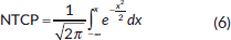 v is the fractional volume receiving a dose D, TD is the tolerance dose and TD50 is the tolerance dose corresponding to a 50% probability of complications to the healthy tissues, m and n are the parameters of the model. The values of the parameters m, n and TD50 were chosen equal to 0.14, 0.13 and 81 Gy, respectively, according to Peeters [40].