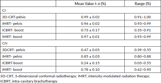 As expected, IMRT boost dose distribution was more homogeneous than ICBRT, in fact the comparison was statistically significant in terms of maximum and minimum dosees (p = 0.001 and p < 0.0001, respectively), V85Gy and V95Gy (p = 0.0002 and p = 0.0001, respectively), and CN and CI (p < 0.0001 and p = 0.0003, respectively). When comparing OARs doses, the value of D2cm3 was in favour of ICBRT. In fact, the D2cm3 values were lower for ICBRT than IMRT, being the mean value of the prescription dose for rectum, bowel and urinary bladder of 47.95%, 39.12% and 30.95% for ICBRT and 89.54%, 91.15% and 78.57% for IMRT, respectively.