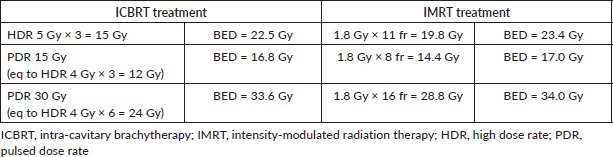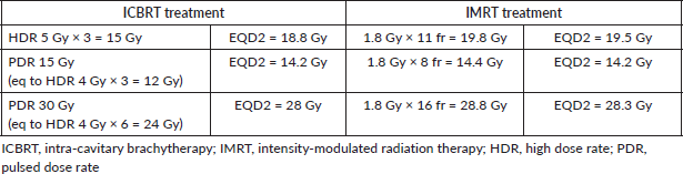 According to the literature, IMRT boost prescription doses were established calculating the BED of the ICBRT boost taking into account the dose rate [26–29] as follows: