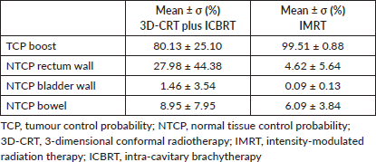 Results: Mean conformity index value calculated on boost volume was 0.73 for ICBRT and 0.97 for IMRT. Mean conformation number was 0.24 for ICBRT boost and 0.78 for IMRT boost. Mean normal tissue complication probability (NTCP) values for 3D-CRT plus ICBRT and for IMRT (pelvis plus boost) were, respectively, 28% and 5% for rectum; 1.5% and 0.1% for urinary bladder and 8.9% and 6.1% for bowel.